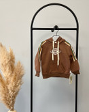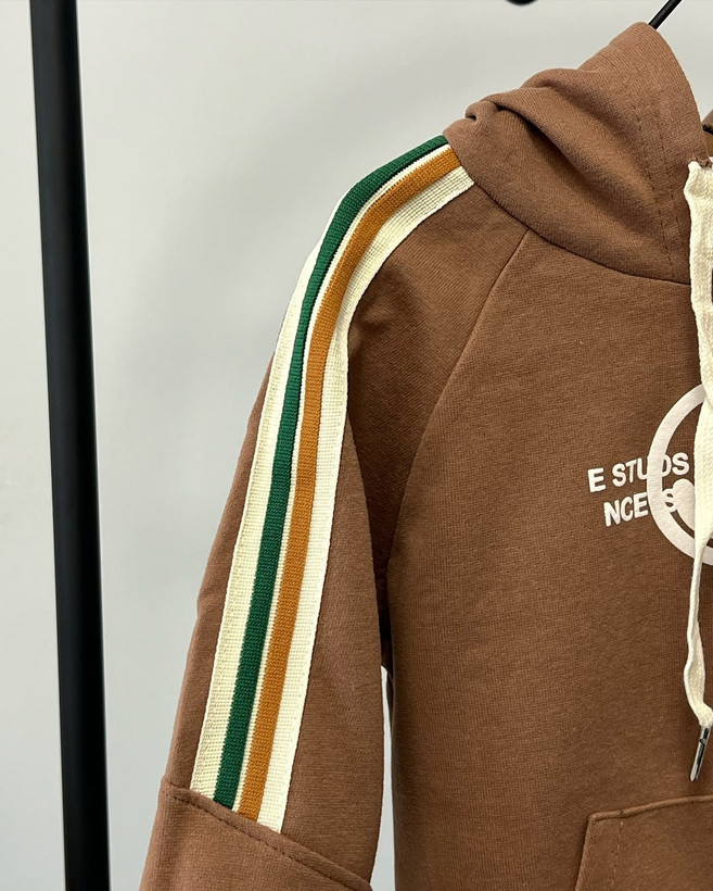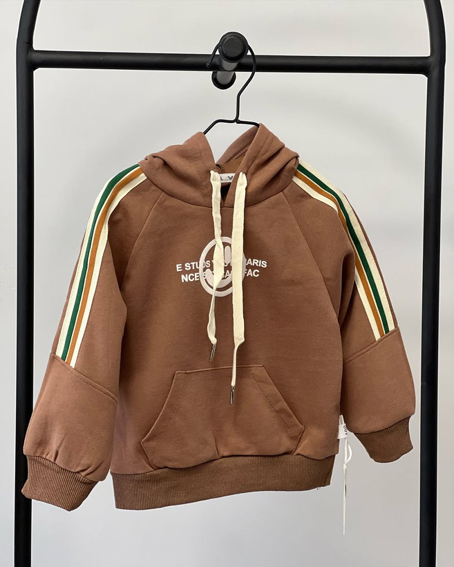 این هودی اسپرت و جذاب با طراحی خاص و رنگ قهوهای گرم، یکی از انتخابهای شیک برای پاییز و زمستان کوچولوی شماست.