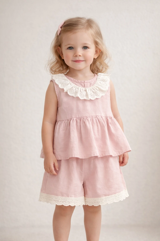 ست دوتکه دخترانه وارداتی پوپلین – تاپ یقهدار و شلوارک گیپوردار