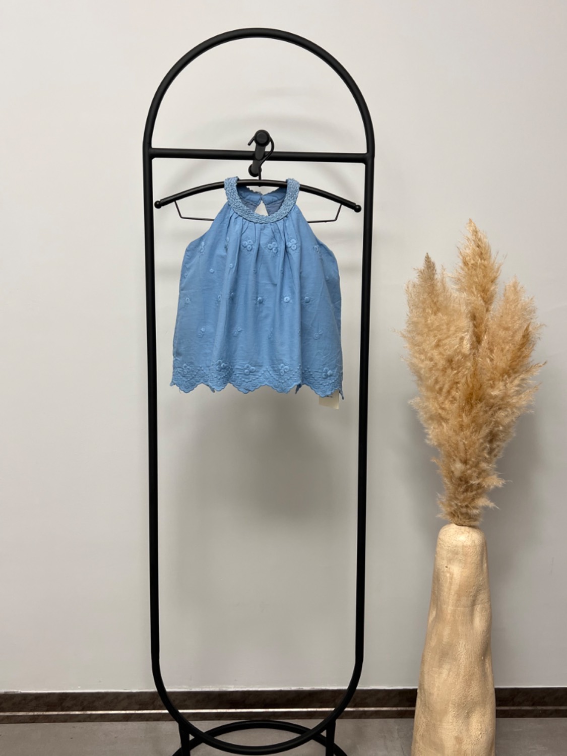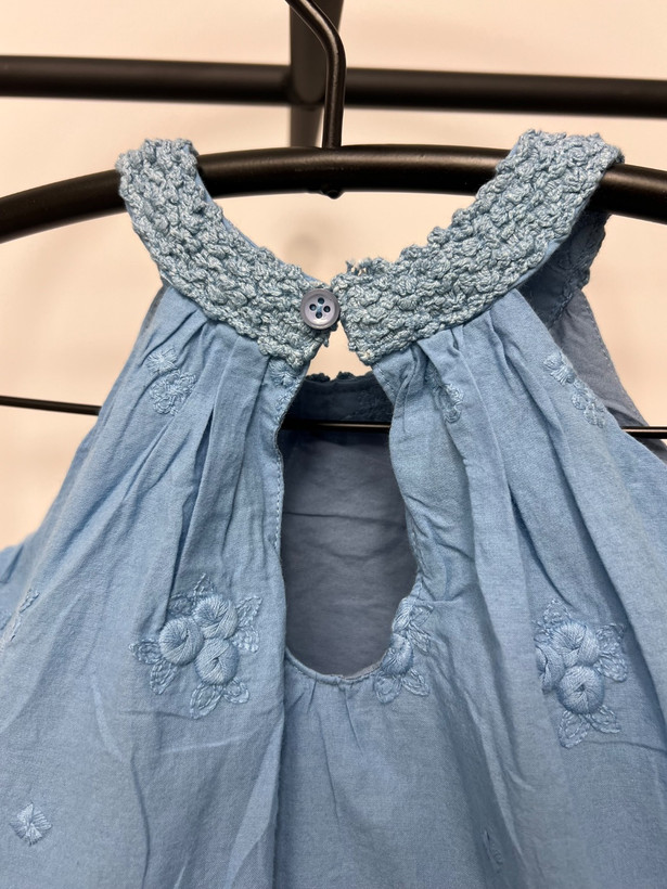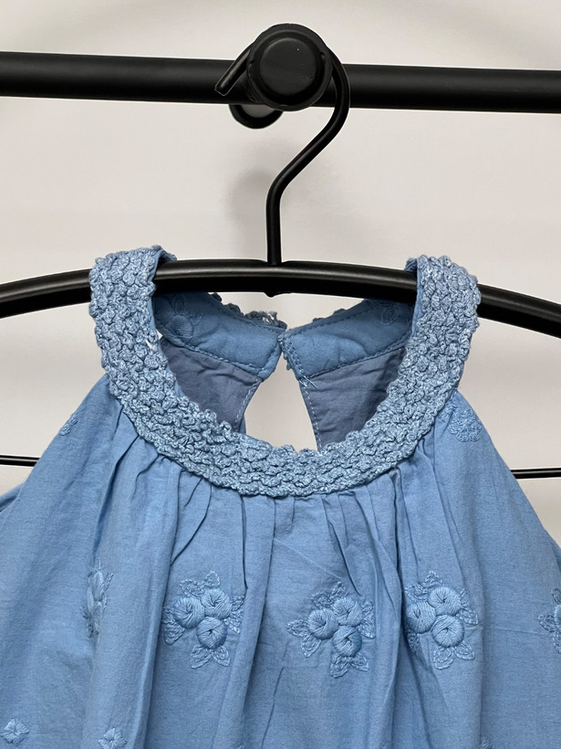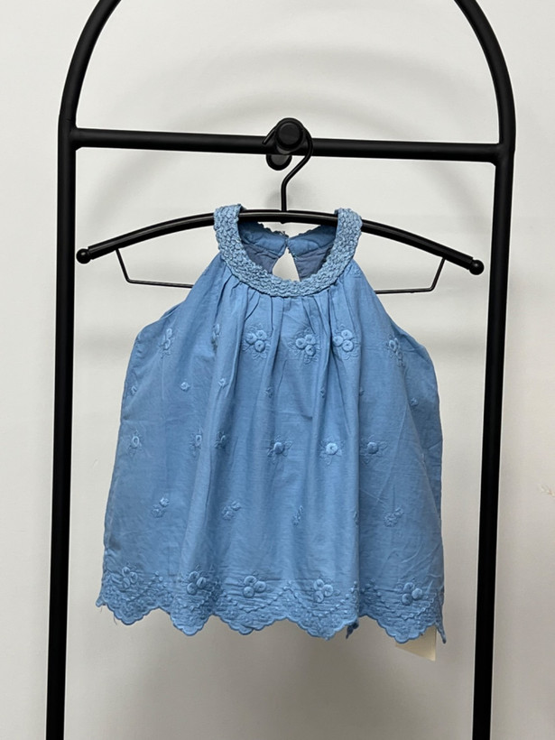 بلوز دخترانه کودک با جنس کاملاً نخی و لطیف، مناسب پوست حساس کودکان. این لباس دارای لایه آستر پارچهای داخلی است که باعث راحتی بیشتر، ایست بهتر لباس و جلوگیری از بدننمایی میشود. طراحی بدون آستین با یقه چیندار ظریف و گلدوزی گلدار روی پارچه، ظاهری شیک و کودکانه ایجاد کرده است. لبه پایین بلوز نیز با دوخت گلدوزیشده تزیین شده است.