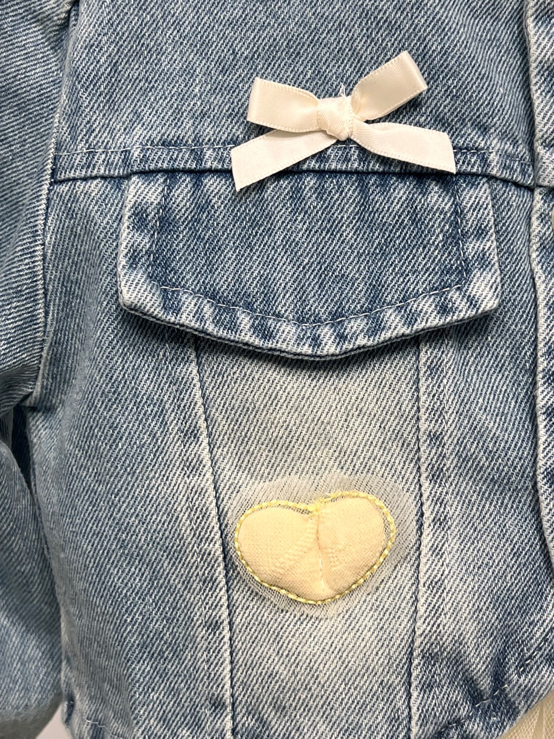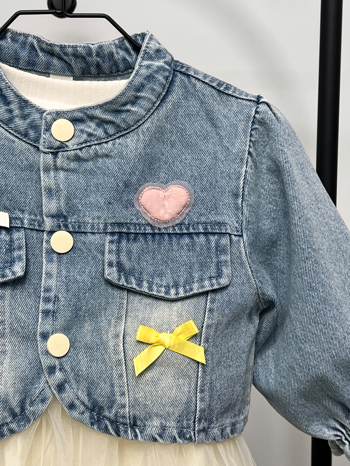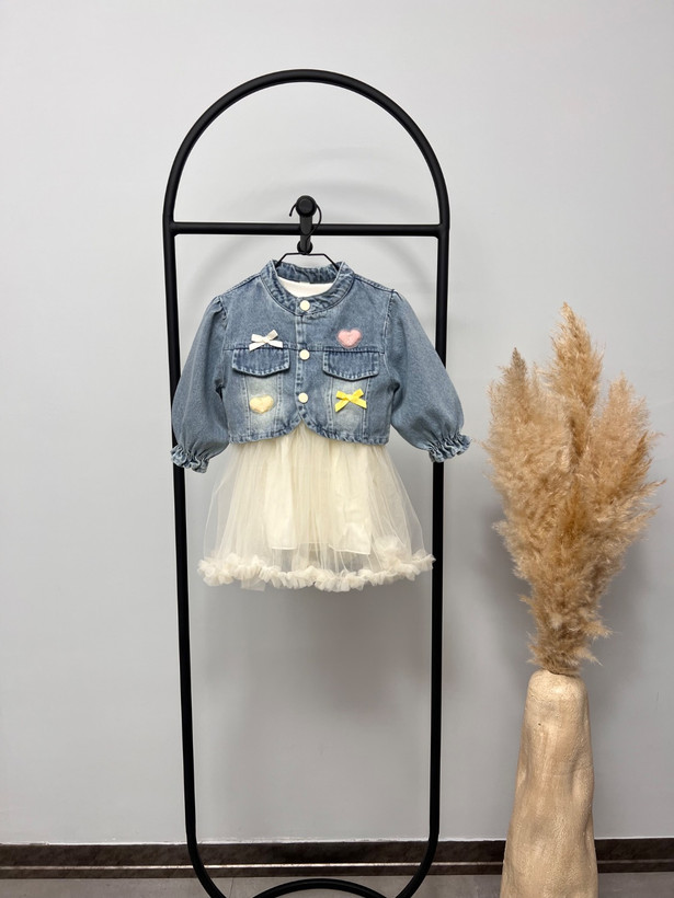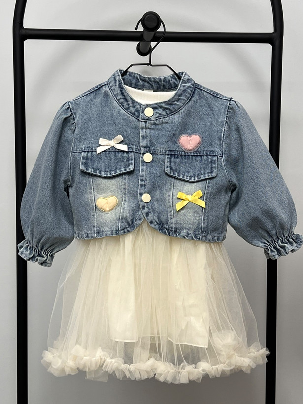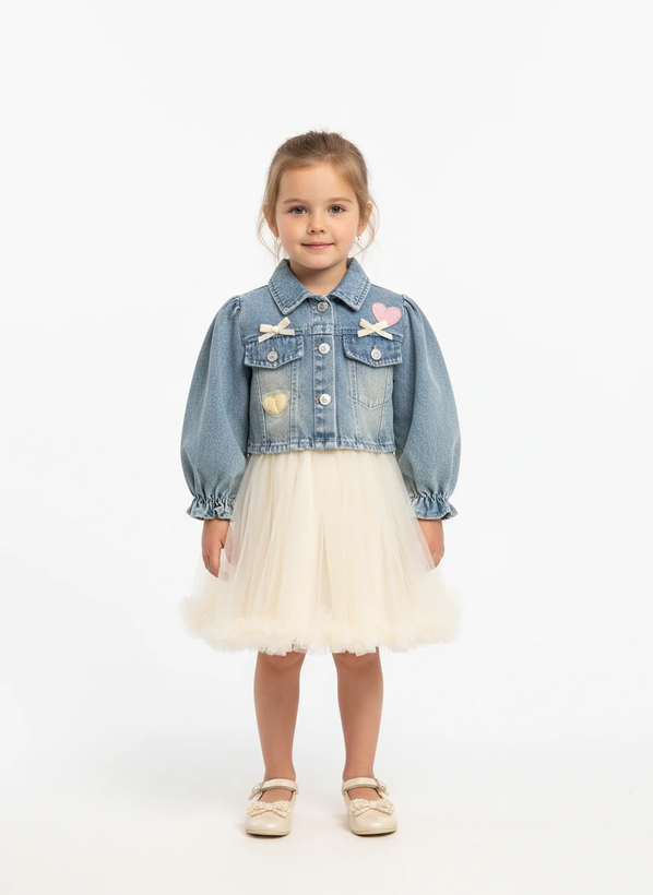 پیراهن با بخش بالاتنه نرم و لطیف و دامن تور سبک با لبه چیندار، ظاهری دخترانه و لطیف ایجاد میکند. کت جین کوتاه با دکمههای جلو، آستین پفی و تزیین پاپیون و قلبهای فانتزی جلوهای جذاب و کودکانه به استایل میدهد و امکان استفاده جداگانه با لباسهای دیگر را نیز دارد.