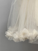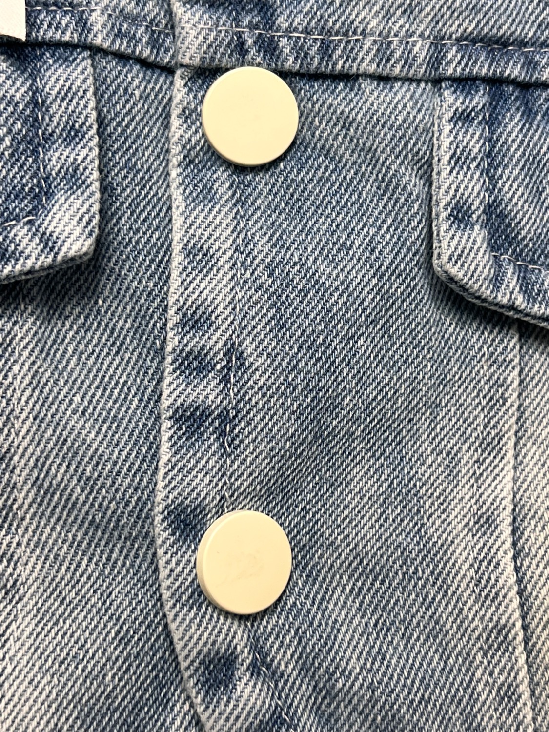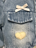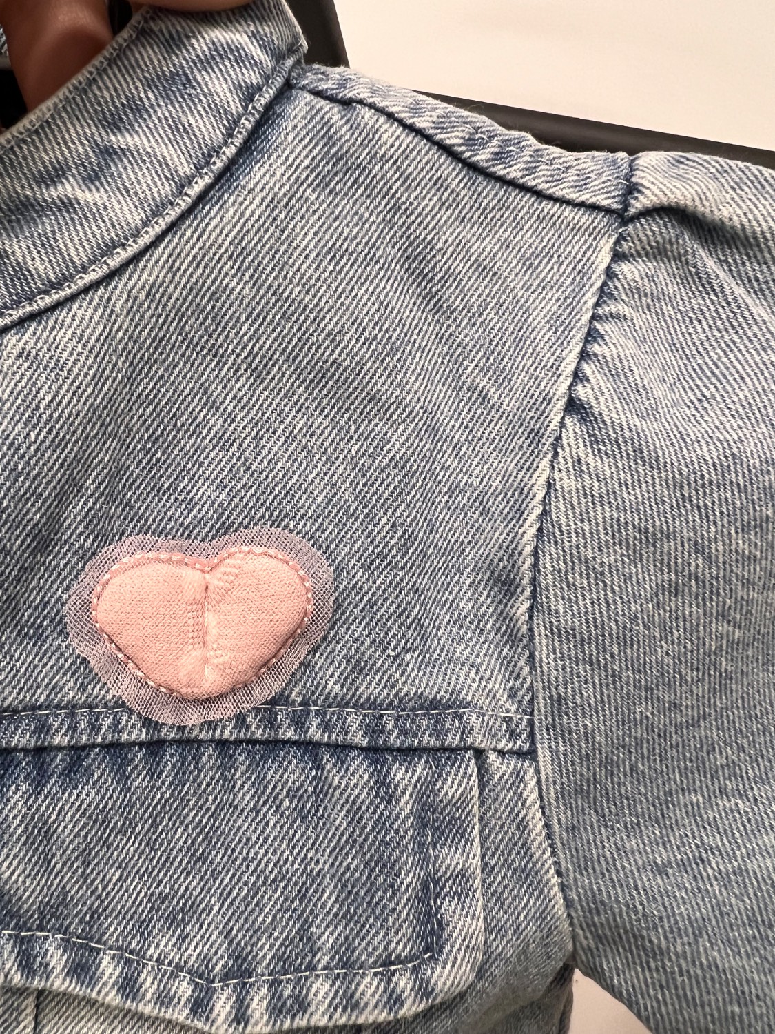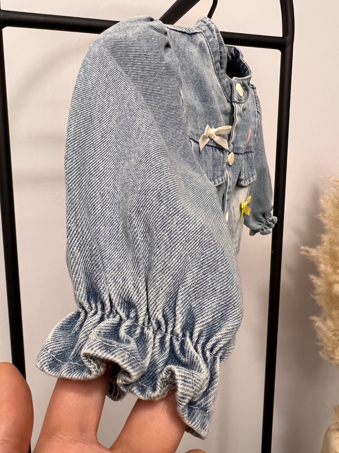 پیراهن با بخش بالاتنه نرم و لطیف و دامن تور سبک با لبه چیندار، ظاهری دخترانه و لطیف ایجاد میکند. کت جین کوتاه با دکمههای جلو، آستین پفی و تزیین پاپیون و قلبهای فانتزی جلوهای جذاب و کودکانه به استایل میدهد و امکان استفاده جداگانه با لباسهای دیگر را نیز دارد.