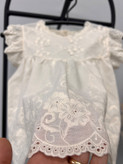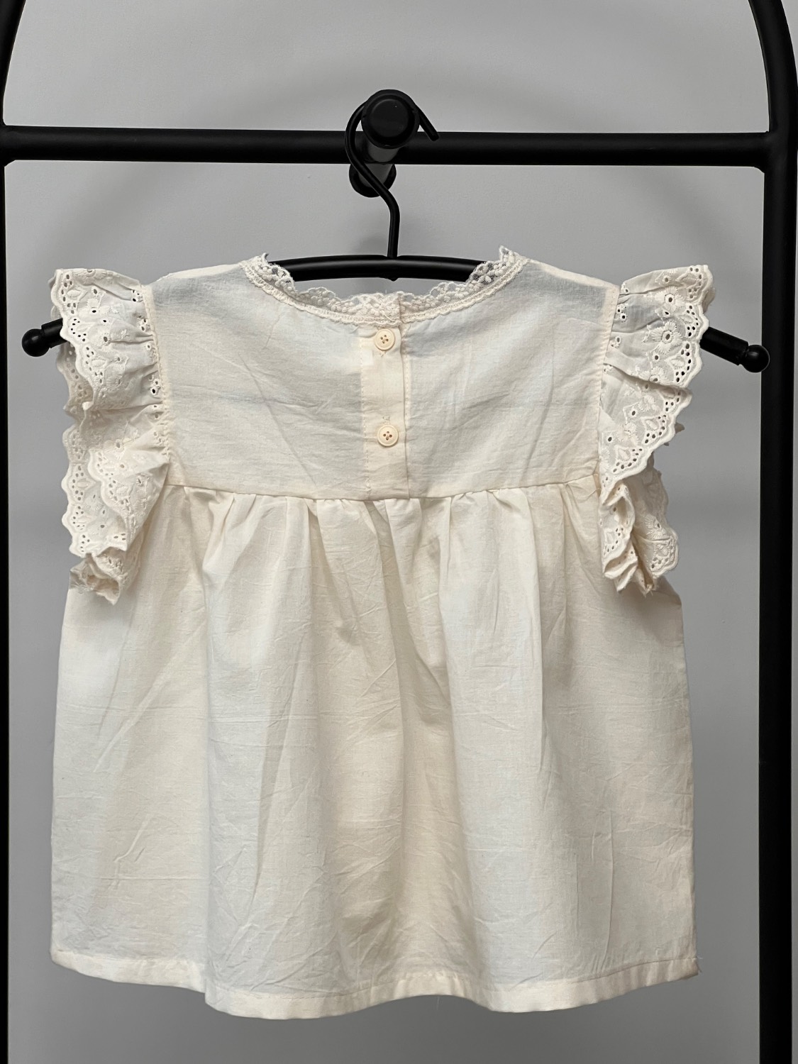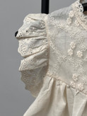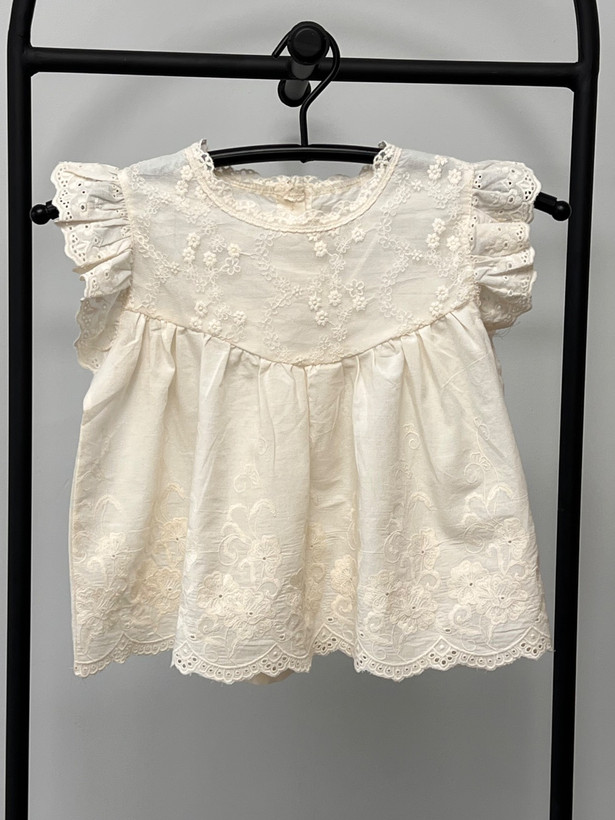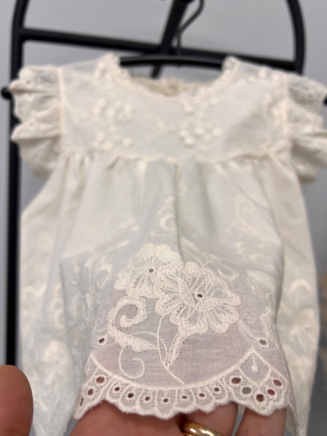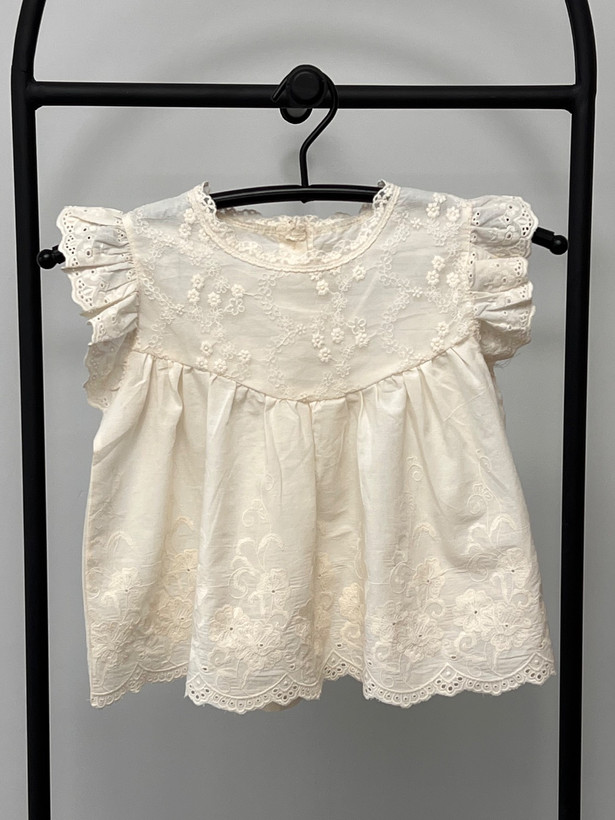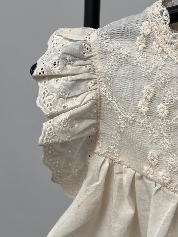 مدل یقه گرد با جزئیات دانتل و آستینهای چیندار، ظاهر لباس را فانتزی و چشمنواز کرده است. پایین کار نیز با لبههای گلدوزی و طرحدار دوخته شده که حس لباسهای لاکچری کودکانه را منتقل میکند. فرم آزاد شومیز باعث راحتی کامل کودک در کنار شیکپوشی میشود.