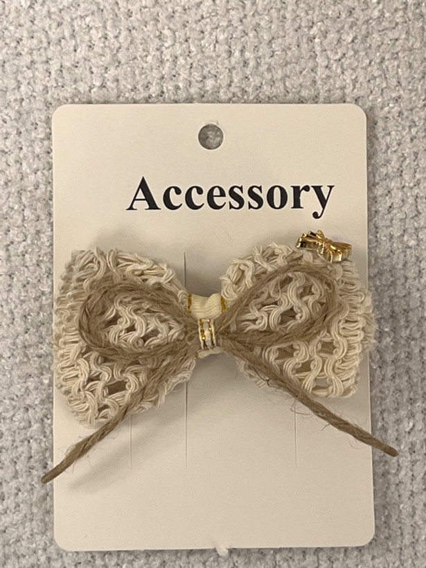 گیره مو دخترانه با طراحی پاپیون بافتدار و ظریف، انتخابی شیک و مینیمال برای استایلهای خاص و دخترانه. بافت نخمانند و رنگ کرم طبیعی در کنار جزئیات طلایی، جلوهای لطیف و لوکس به موها میبخشد.